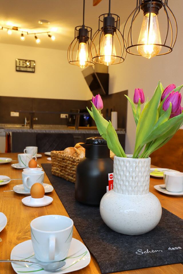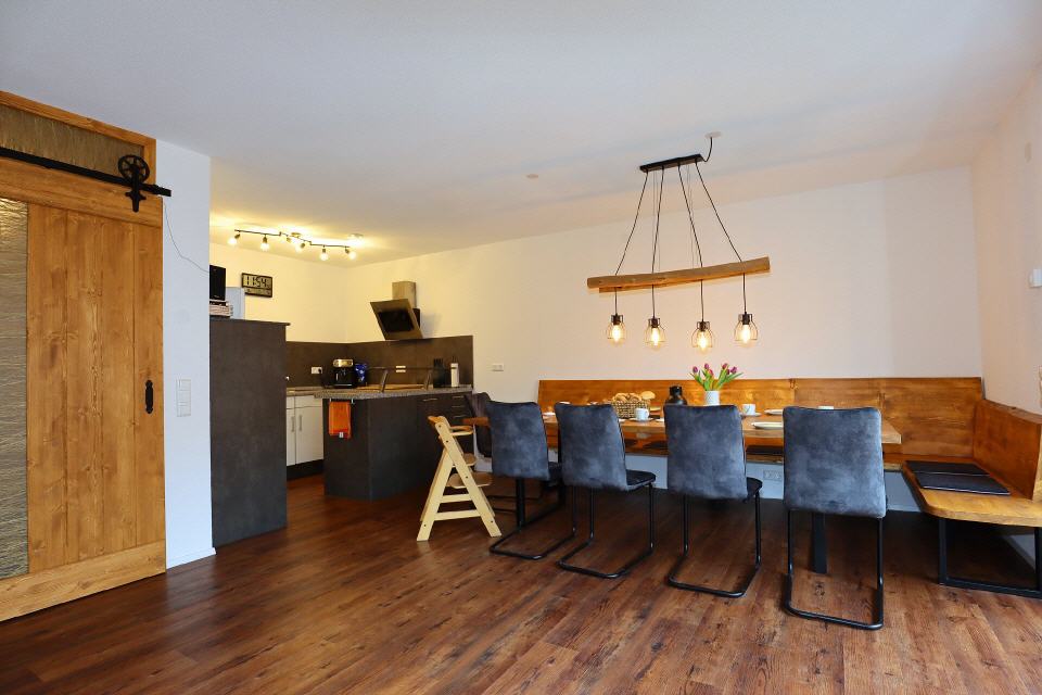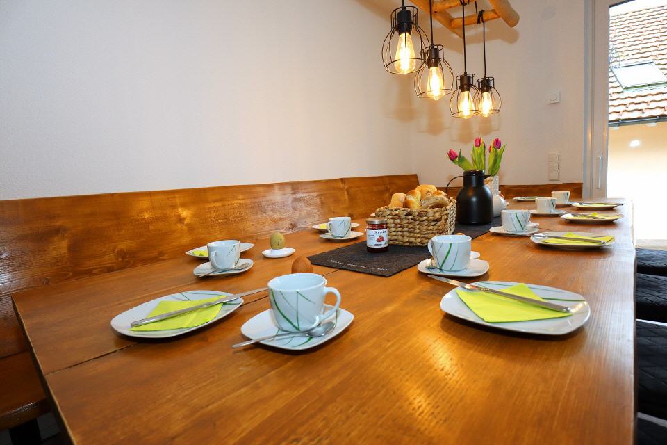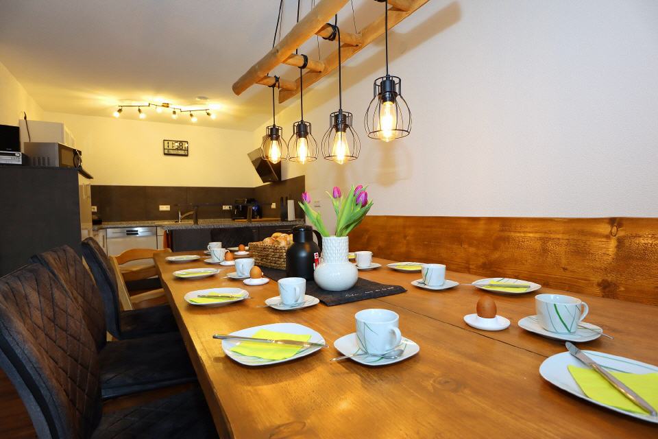 - Der große Esstisch mit Stühlen lädt Sie zum gemütlichen Verweilen ein.
