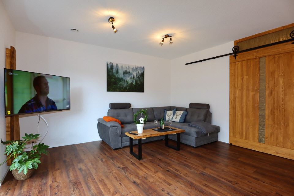 - Im Wohnzimmer befindet sich ein großes Ecksofa mit Tisch und Stühlen, Flachbildfernseher sowie Stereoanlage.